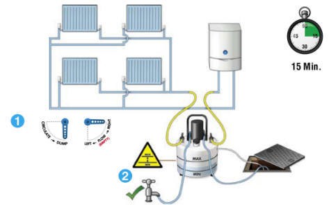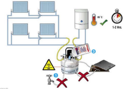 Tesisat Temizleyici yardımıyla çözülen kirler, makina yardımıyla yüksek debi ve tesisata zarar vermiyecek basınçlı su ile yıkanarak, peteklerin su kanalları açılır. Bu işlem sonrasında peteklerin içerisinde hiç Tesisat Temizleyici kalmamalıdır.